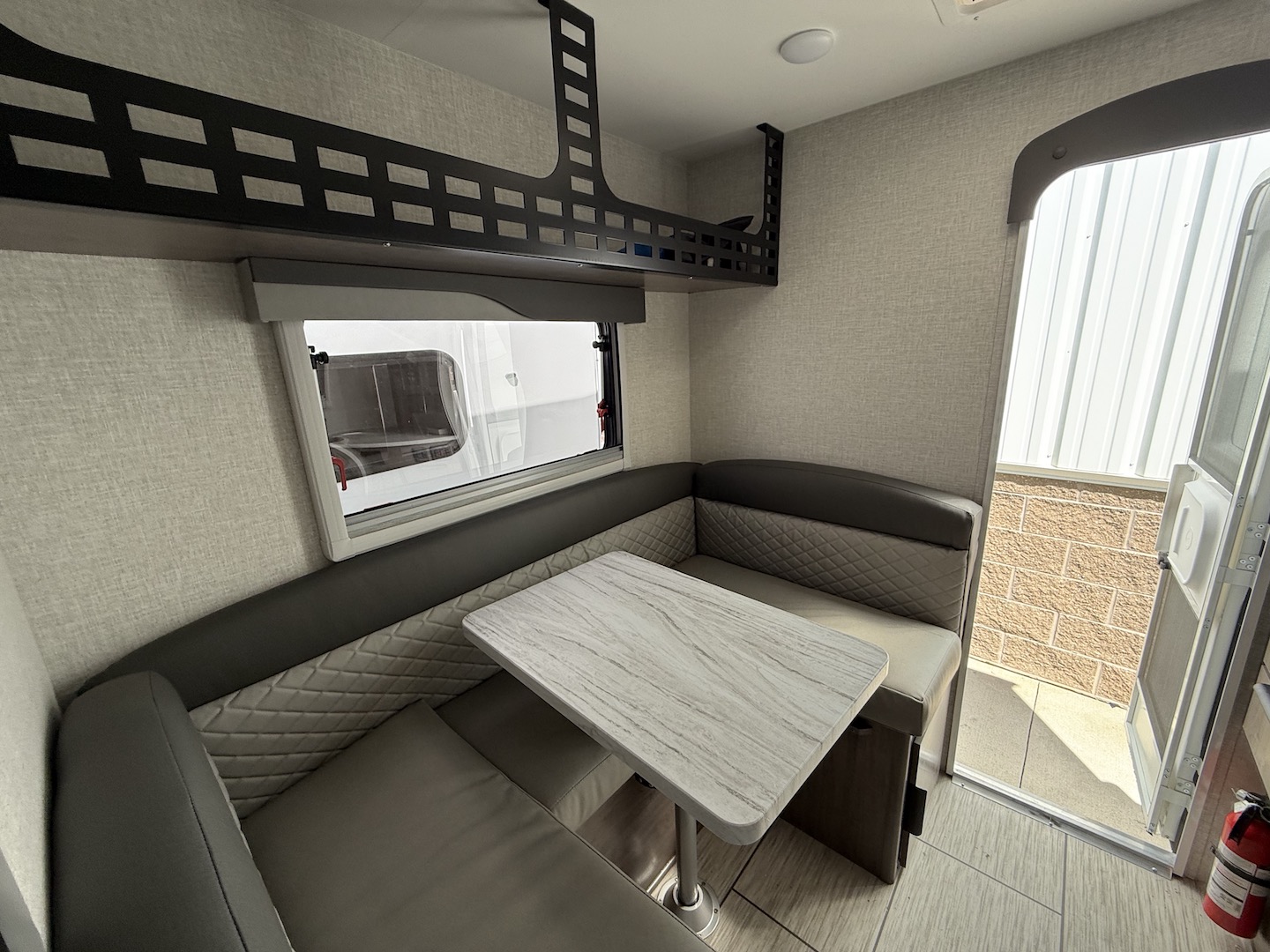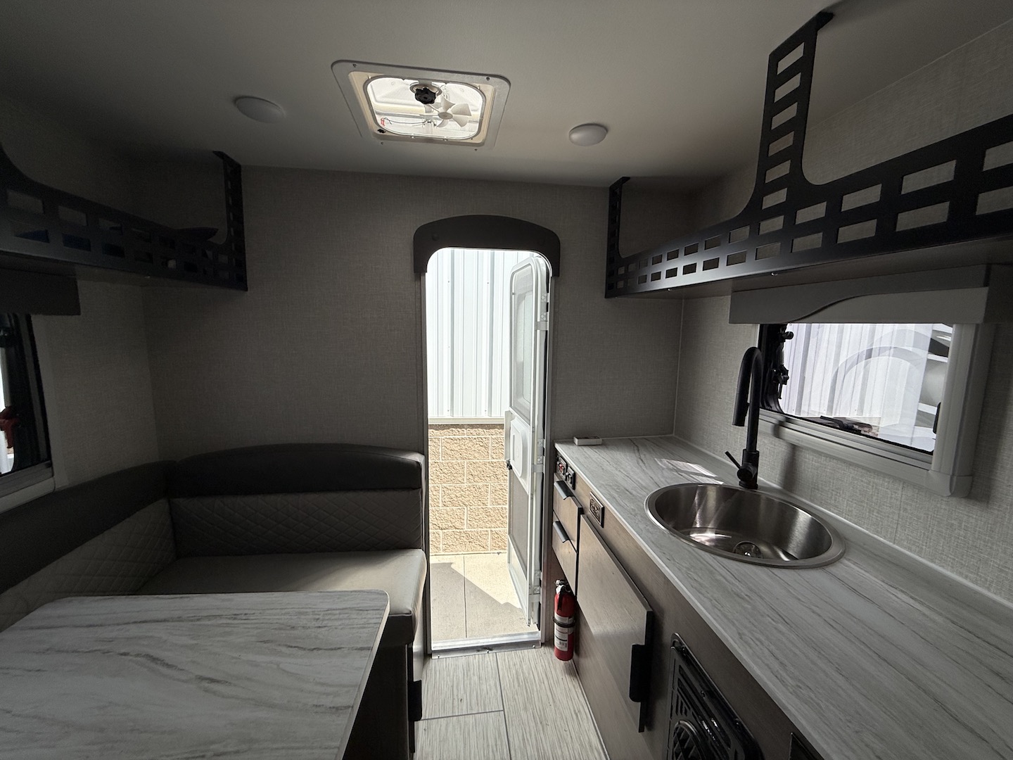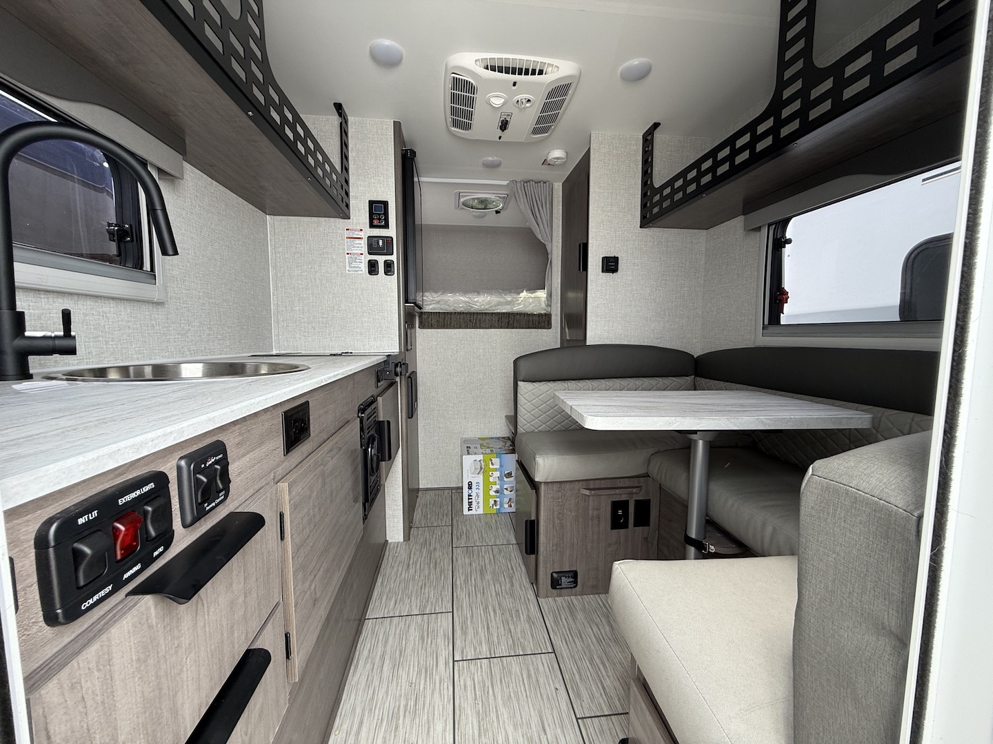 The goal we achieved with this model was to make a more minimalist space that still has all the necessities while staying super lightweight and with dimensions that allow owners of many different trucks and interests the ability to safely load up and hit the road. It boasts the longest countertop of any of our campers at 6′ with a built-in sink and a two-burner cooktop, two drawers and two under sink cabinets. Galley and storage space in any camper is at a premium and instead of building walls and fully faced cabinets and cramming in accents we focused on open space and large windows. Across from the massive countertop you find a large u-shaped dinette to match, above that you find on either side equal length MOLLE (Modular Lightweight Load-carrying Equipment) panels which serve as structure for the cabinet and also offers a huge grid to clip and fasten gear to which allows the owner big possibilities.