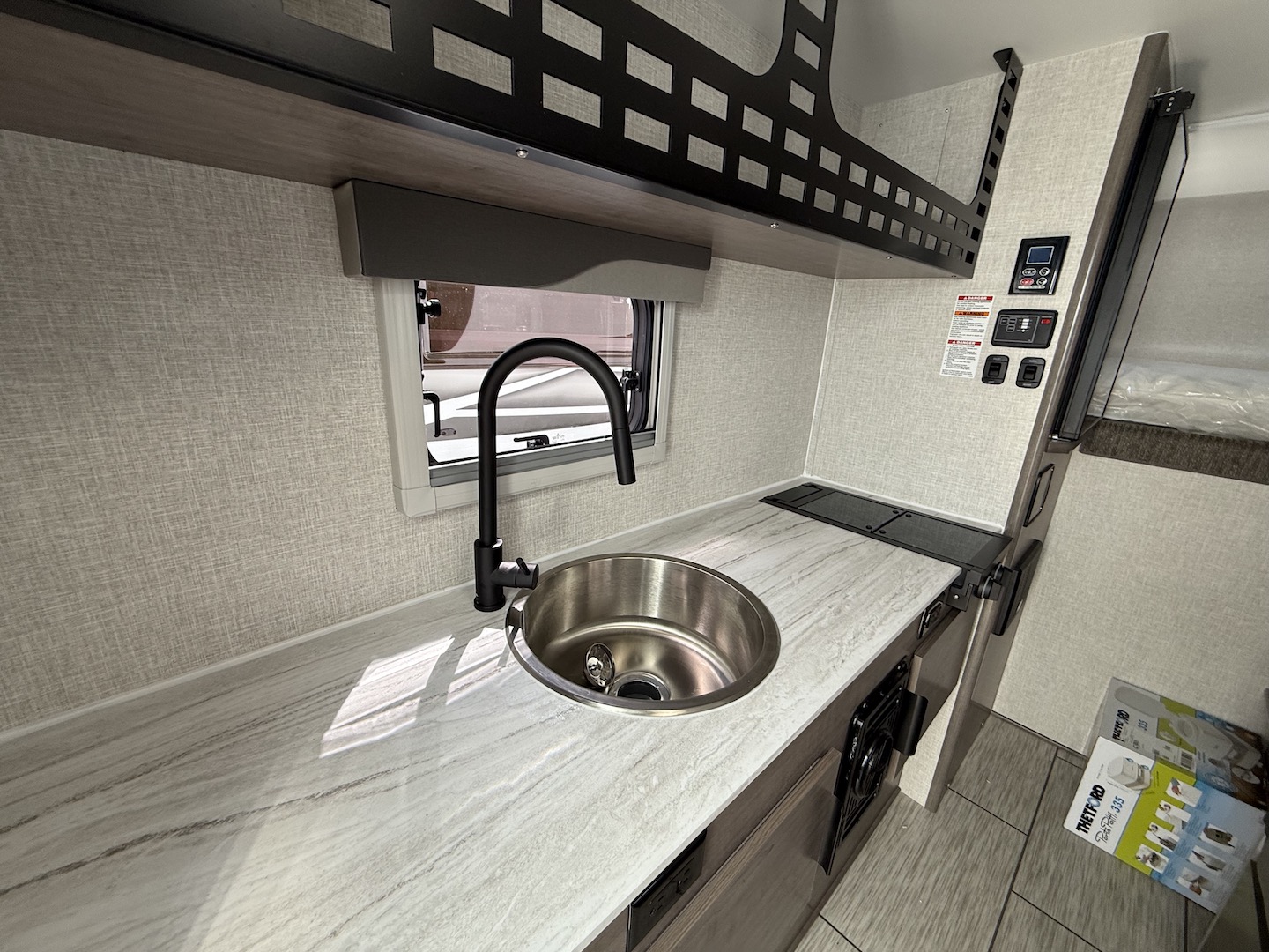Highlights include a 12v refrigerator, real 60″x80″ queen size east/ west bed, porta potti and 23Zero exterior shower enclosure.