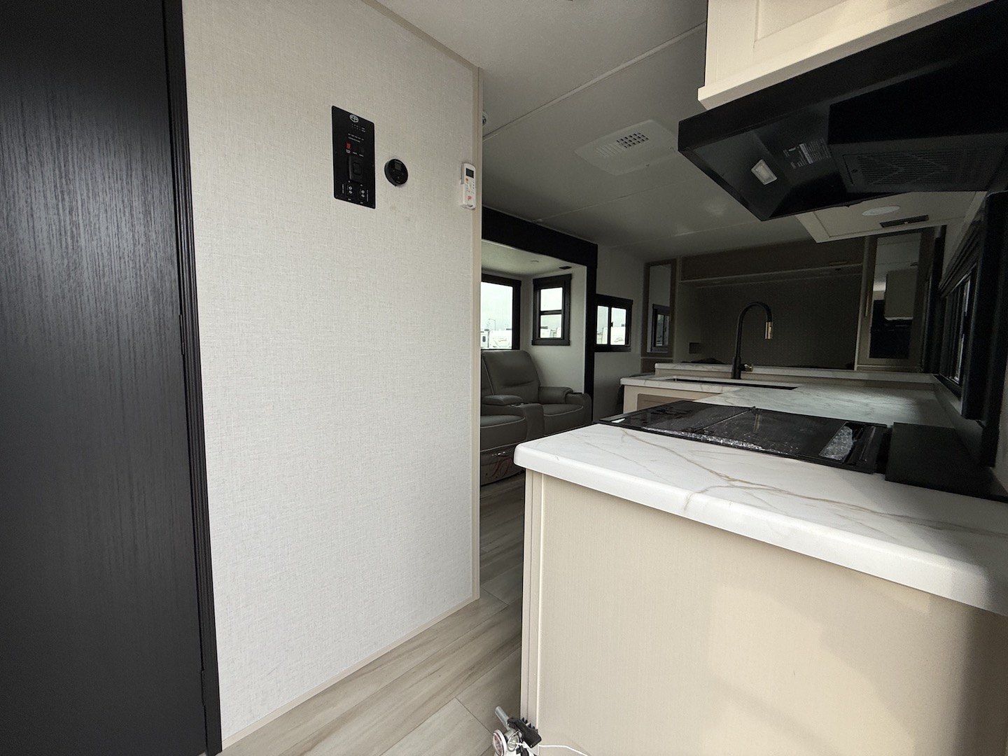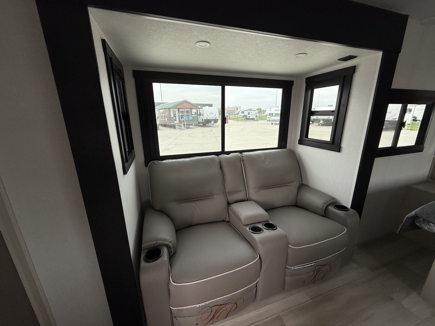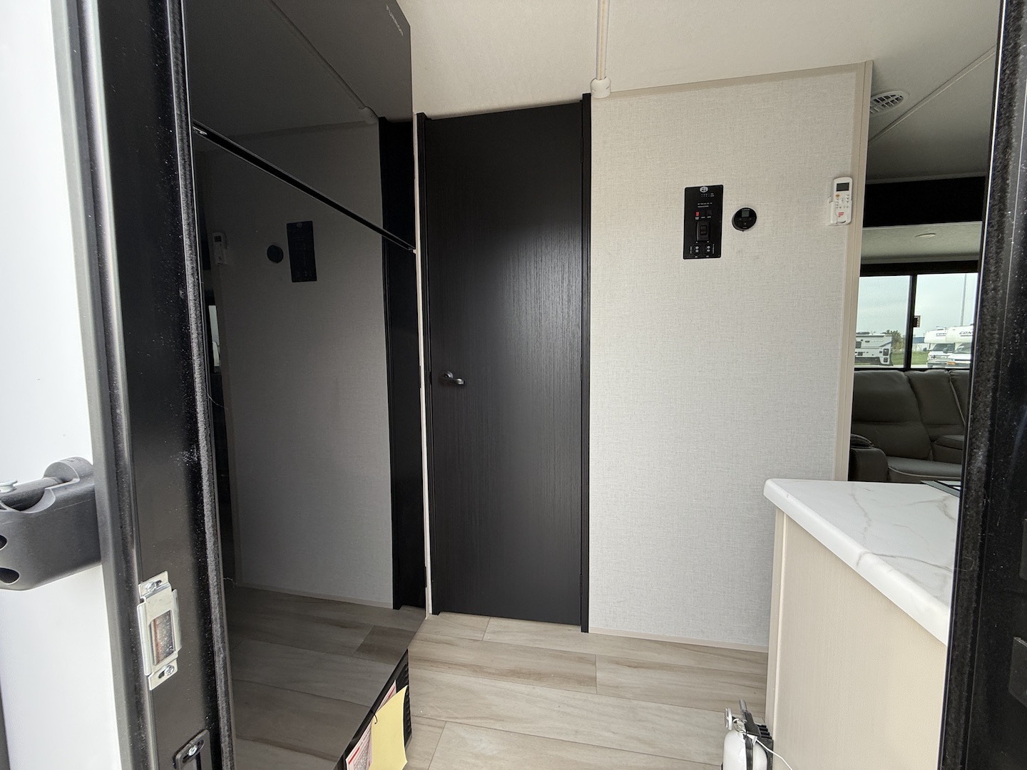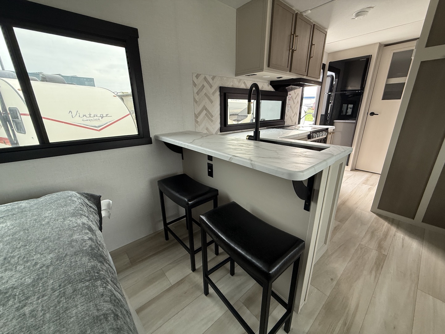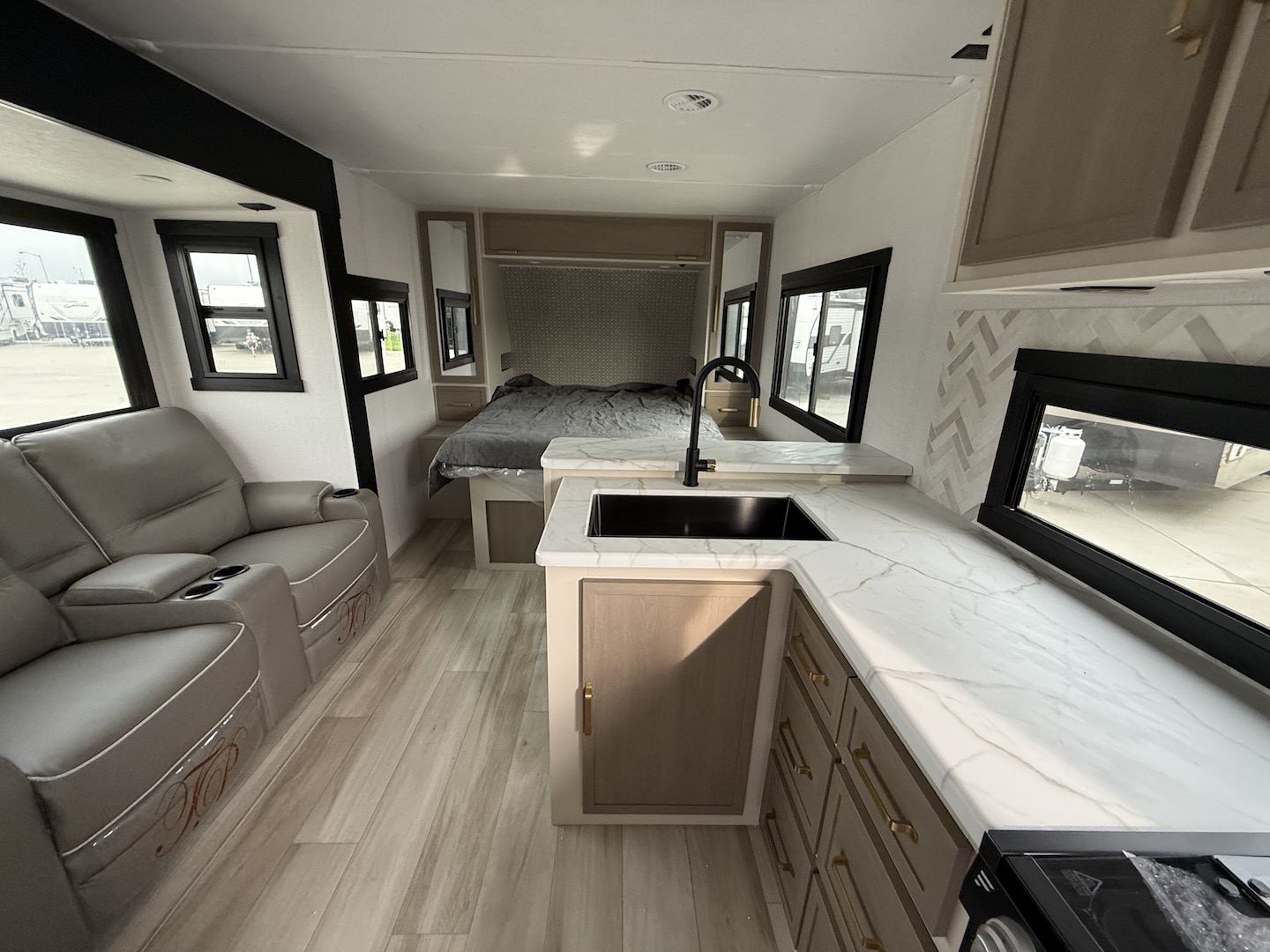 No corners were cut in the 25RBHL. The theater seat (facing the entertainment center) and full-sized dinette separate the best-in-class bathroom and bedroom. 36″ wide sliding barn doors offer complete privacy, or the ability to open the 25RBHL up from front to back. This camper also offers a refrigerator outside underneath the awning.