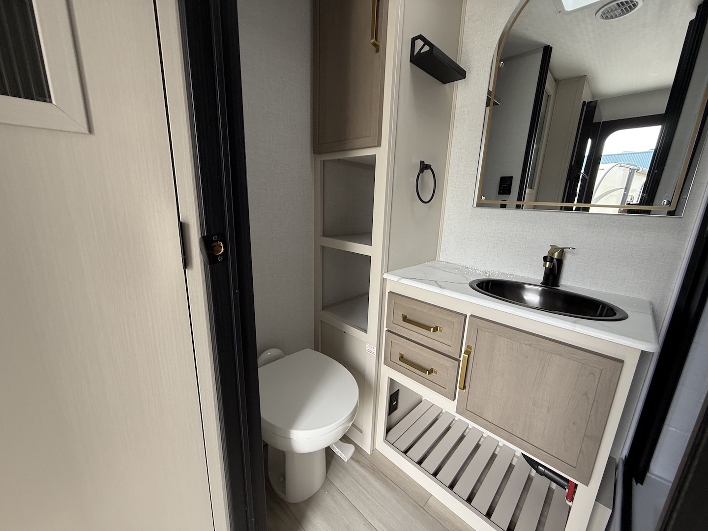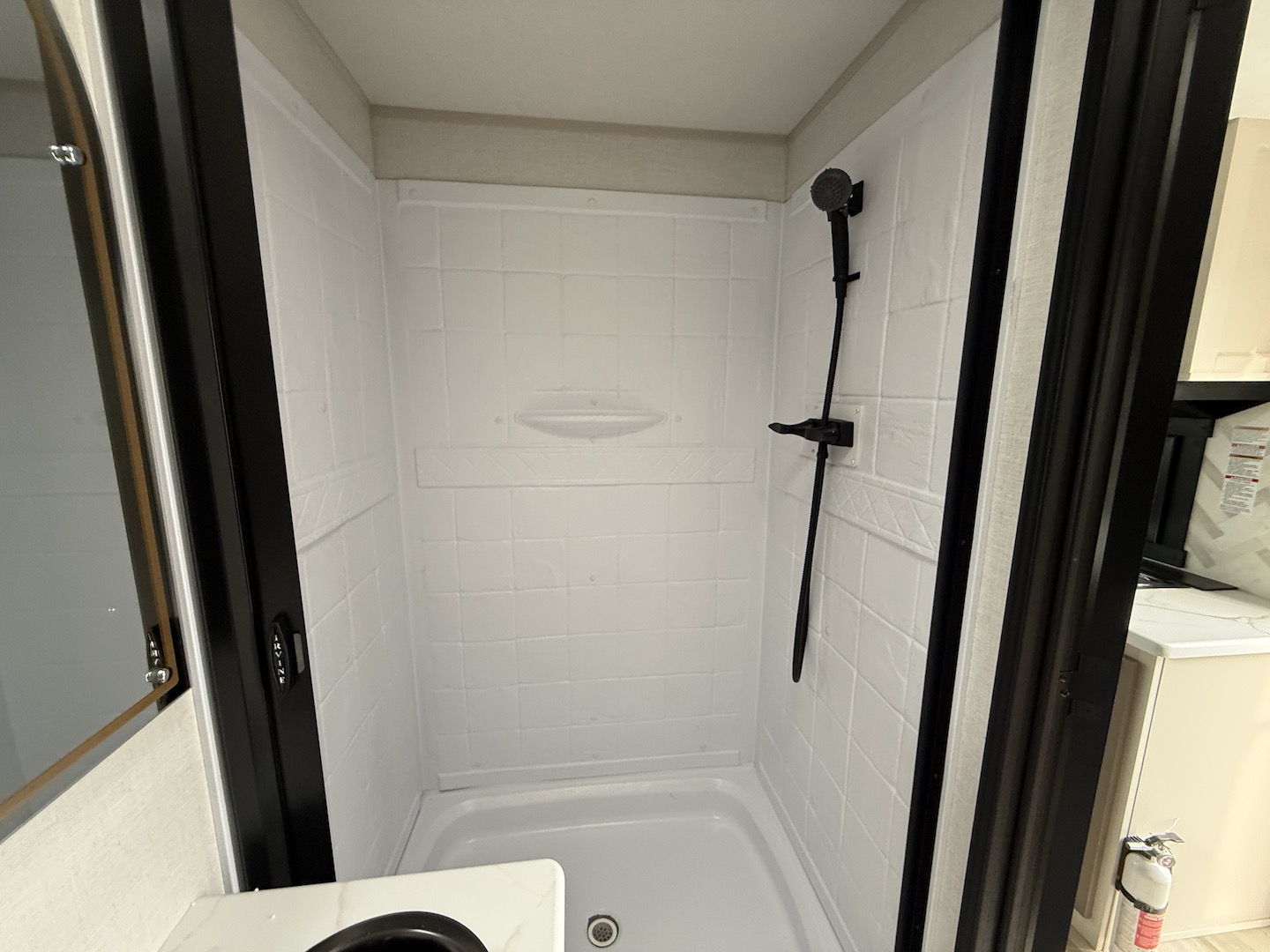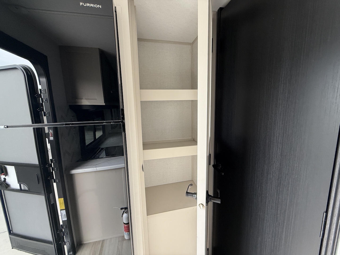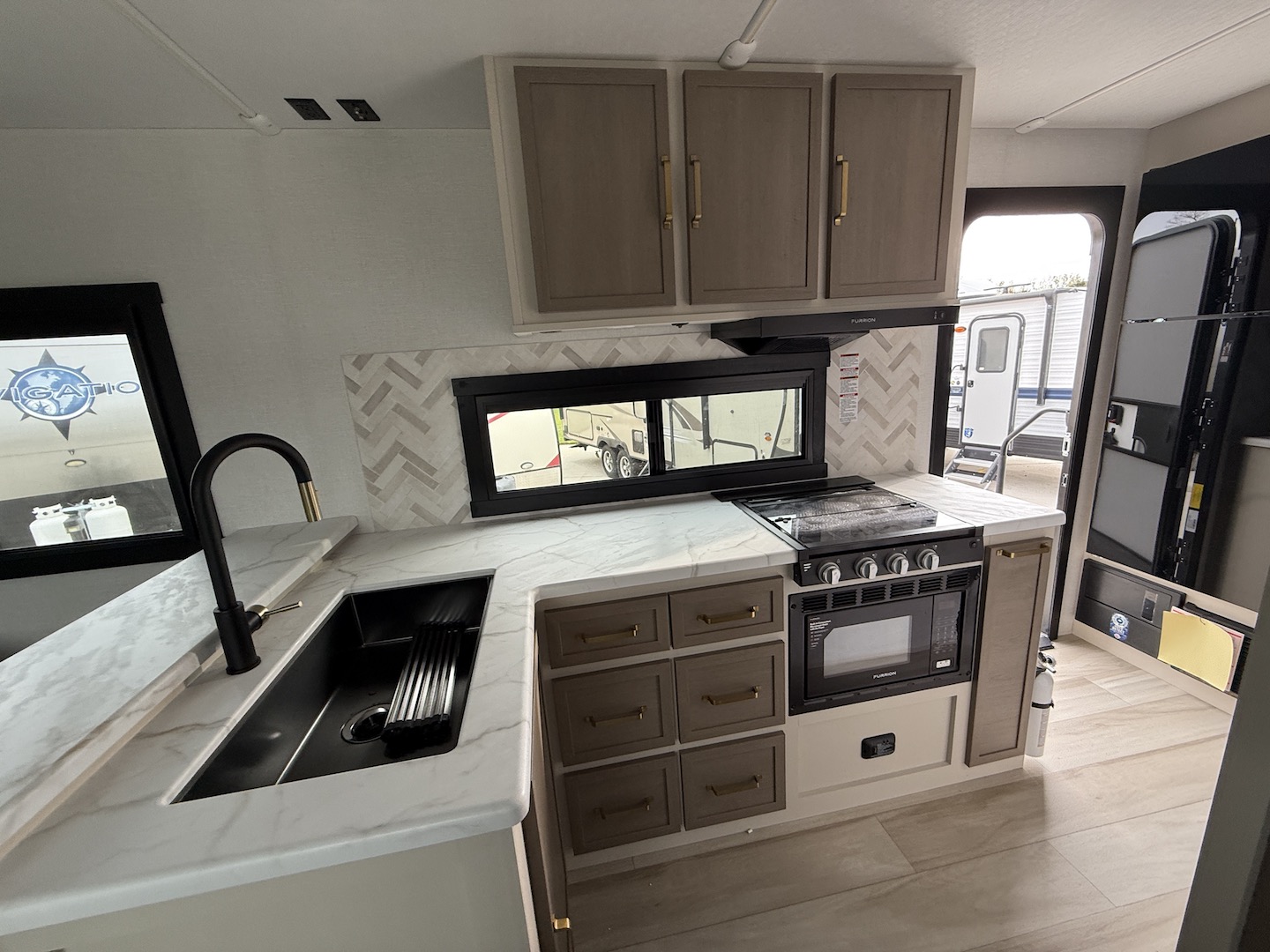 No corners were cut in the 25RBHL. The theater seat (facing the entertainment center) and full-sized dinette separate the best-in-class bathroom and bedroom. 36″ wide sliding barn doors offer complete privacy, or the ability to open the 25RBHL up from front to back. This camper also offers a refrigerator outside underneath the awning.