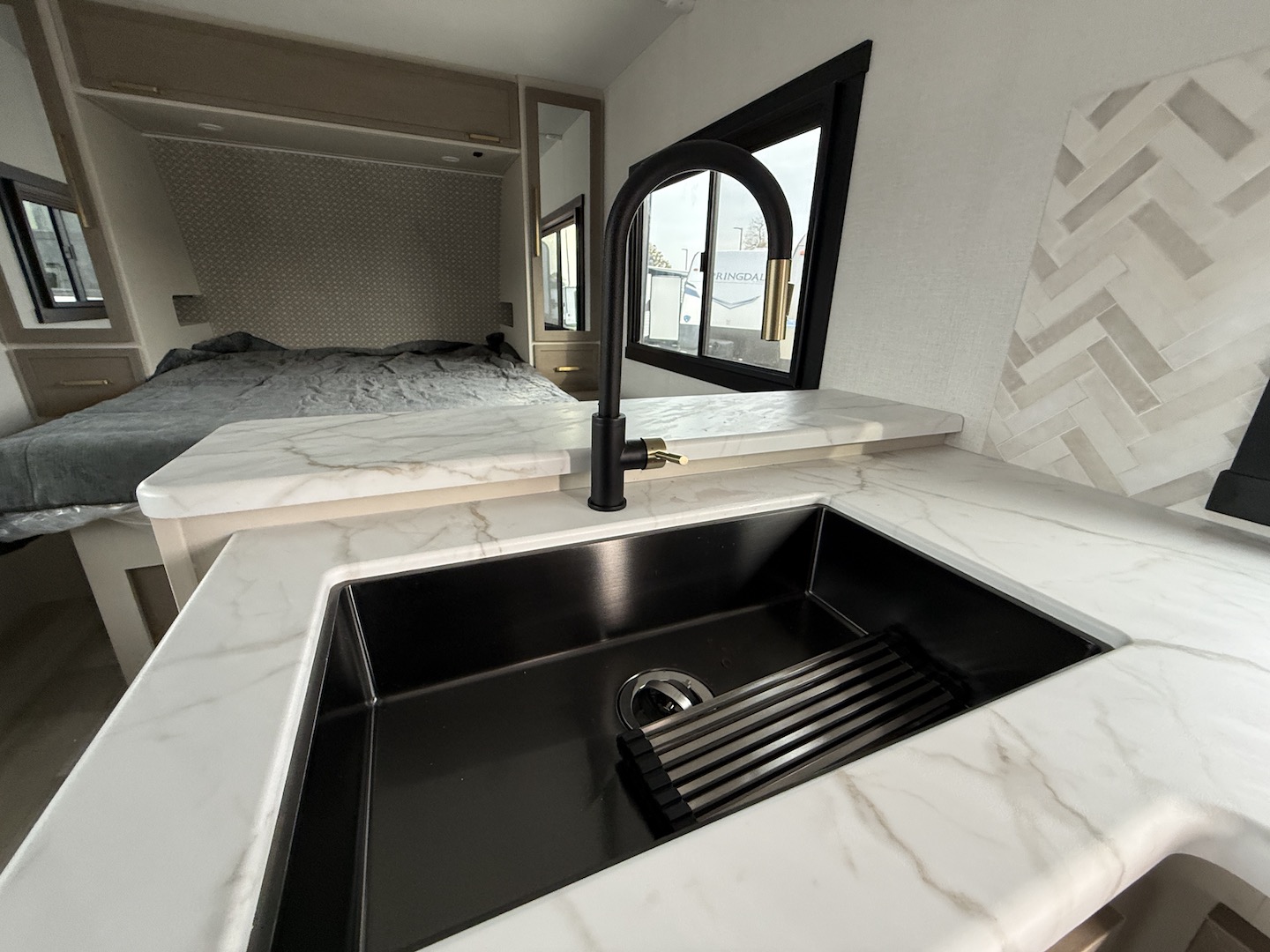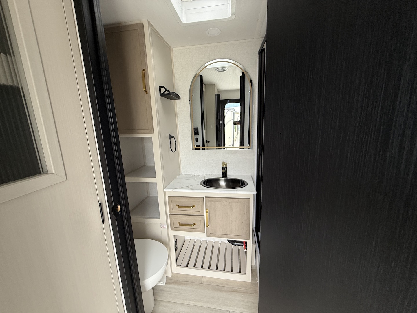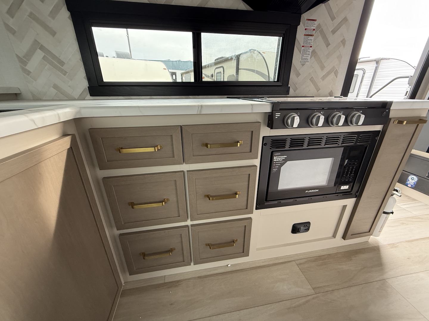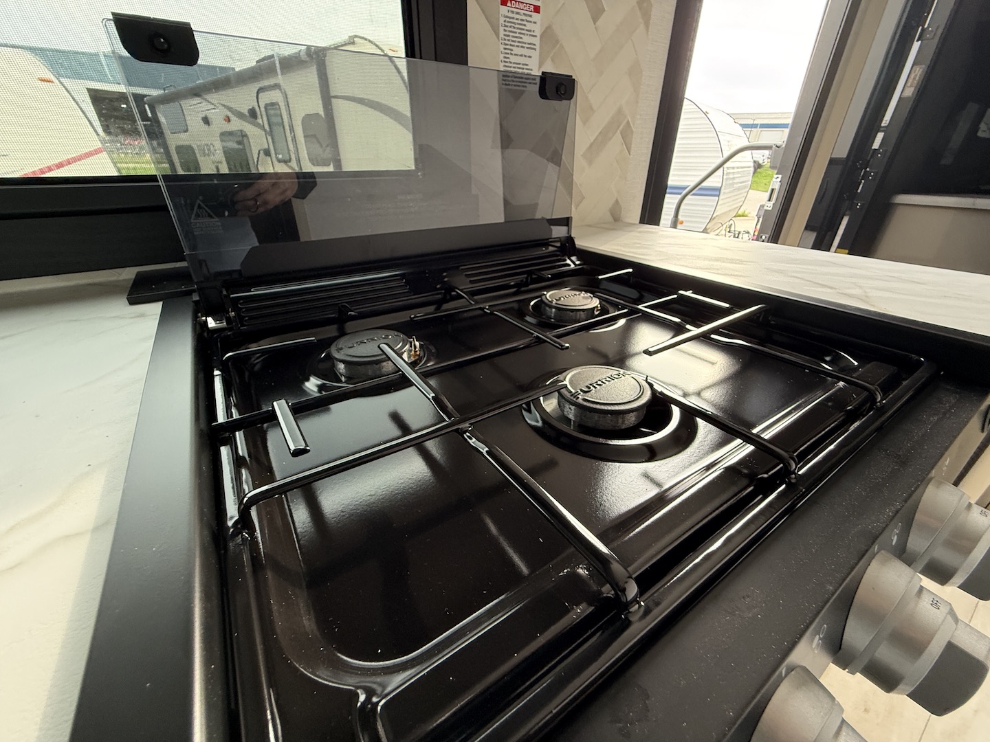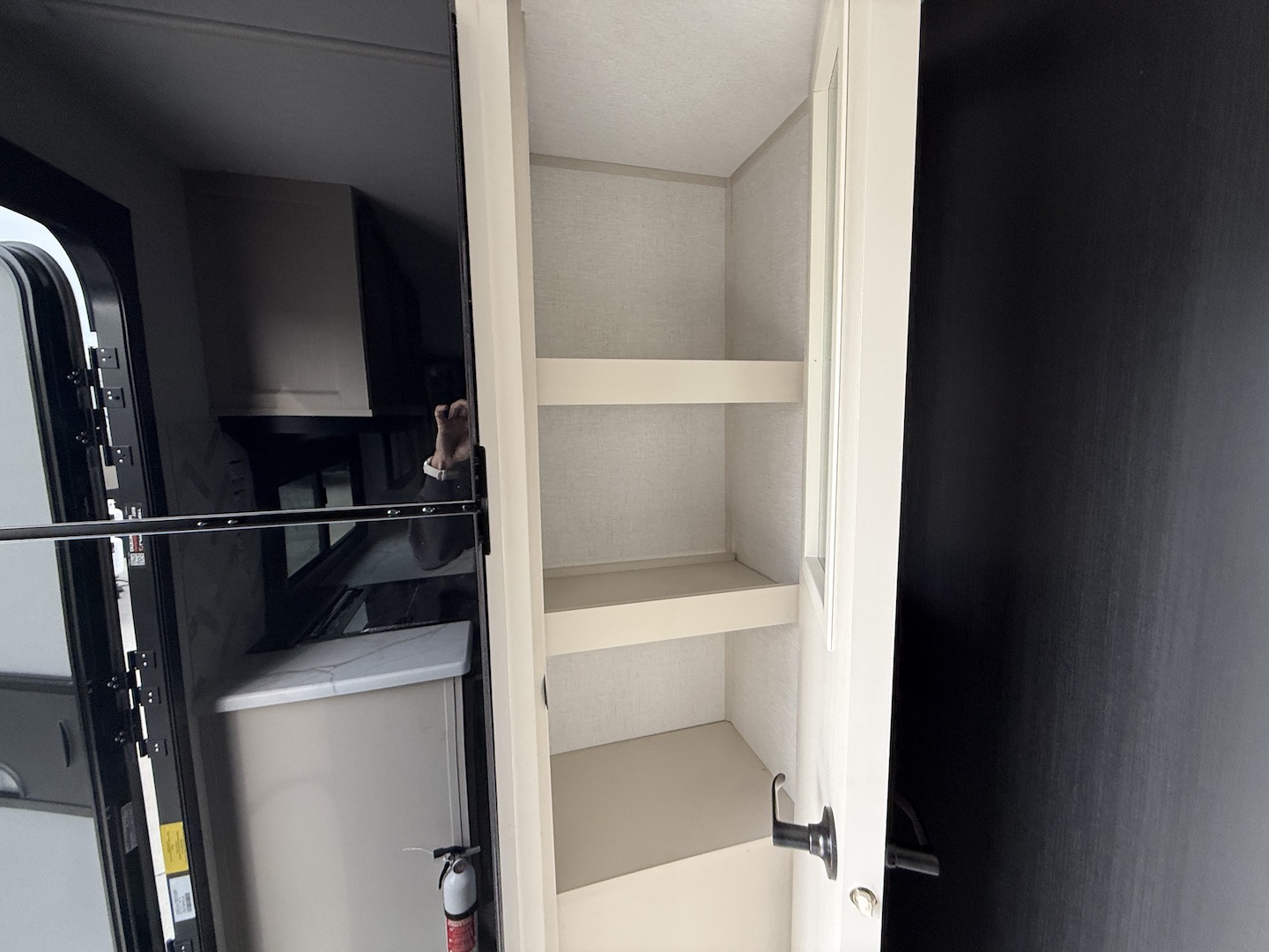 No corners were cut in the 25RBHL. The theater seat (facing the entertainment center) and full-sized dinette separate the best-in-class bathroom and bedroom. 36″ wide sliding barn doors offer complete privacy, or the ability to open the 25RBHL up from front to back. This camper also offers a refrigerator outside underneath the awning.